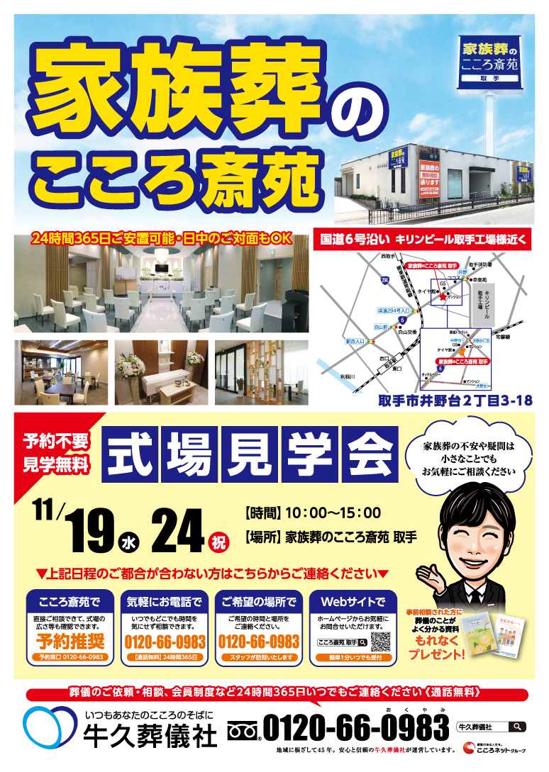 | 内容 | ★家族葬のこころ斎苑 取手式場見学会 開催時間 10:00~15:00 日時を選べて予約不要の式場見学会 11月19日(水) 11月24日(月) 式場見学会当日 事前相談をされた方に葬儀のことがよくわかる資料を進呈 ★会員制度入会のご案内 入会金のみでご葬儀費用を軽減!!(入会金のみ月掛金・年会費0円) あんしん倶楽部 通常入会金1万円(税込) 詳しくは、お問い合わせください。