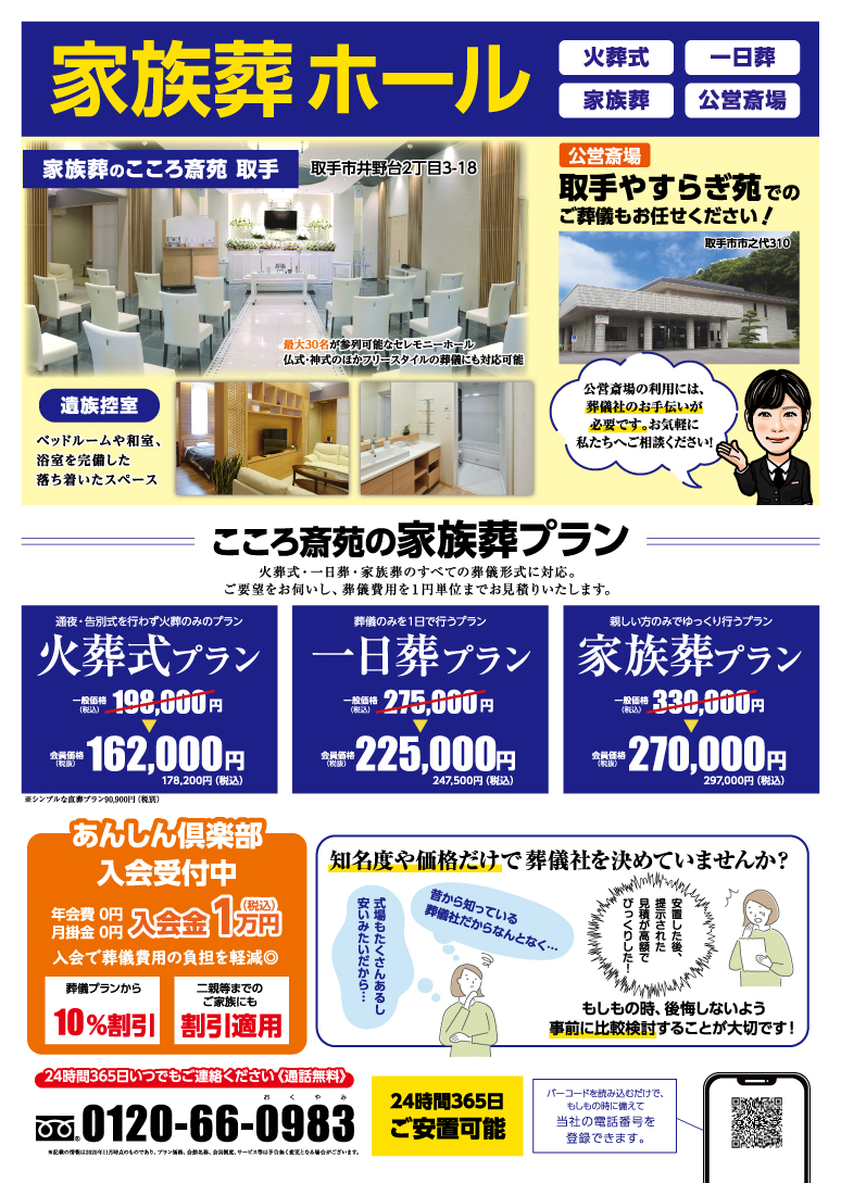 | 日時 開催場所 | 10時00分〜15時00分 家族葬のこころ斎苑 取手 茨城県取手市井野台2丁目3-18 |
