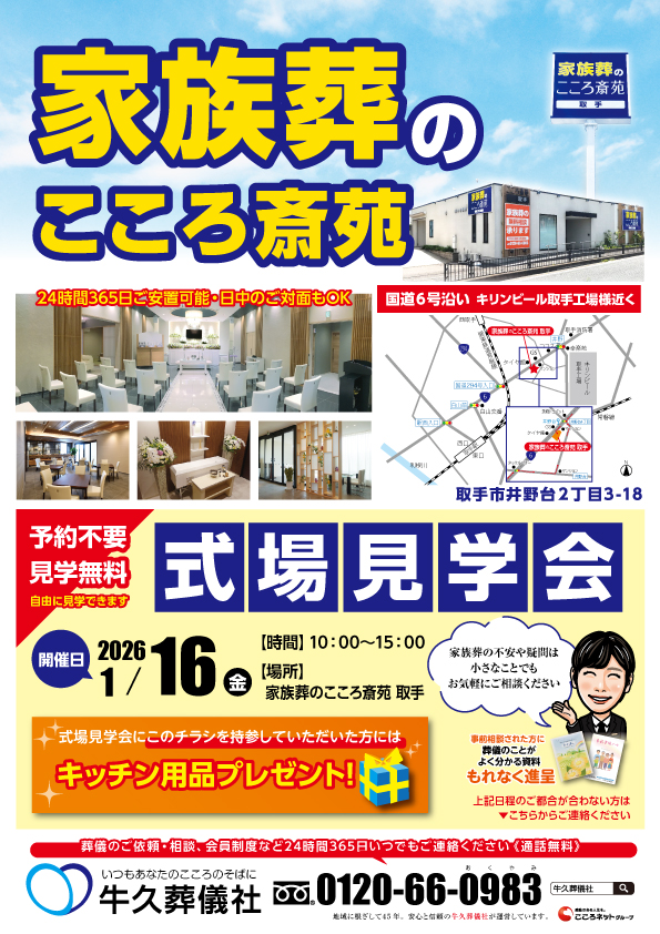 | タイトル | 予約不要の式場見学会(家族葬のこころ斎苑 取手) |