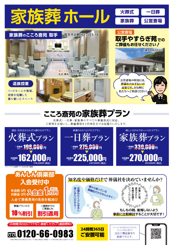 ★家族葬のこころ斎苑 取手式場見学会 開催時間 10:00~15:00 1月16日(金) 式場見学会当日 事前相談をされた方に葬儀のことがよくわかる資料を進呈 ★会員制度入会のご案内 入会金のみでご葬儀費用を軽減!!(入会金のみ月掛金・年会費0円) あんしん倶楽部 通常入会金1万円(税込) 詳しくは、お問い合わせください。