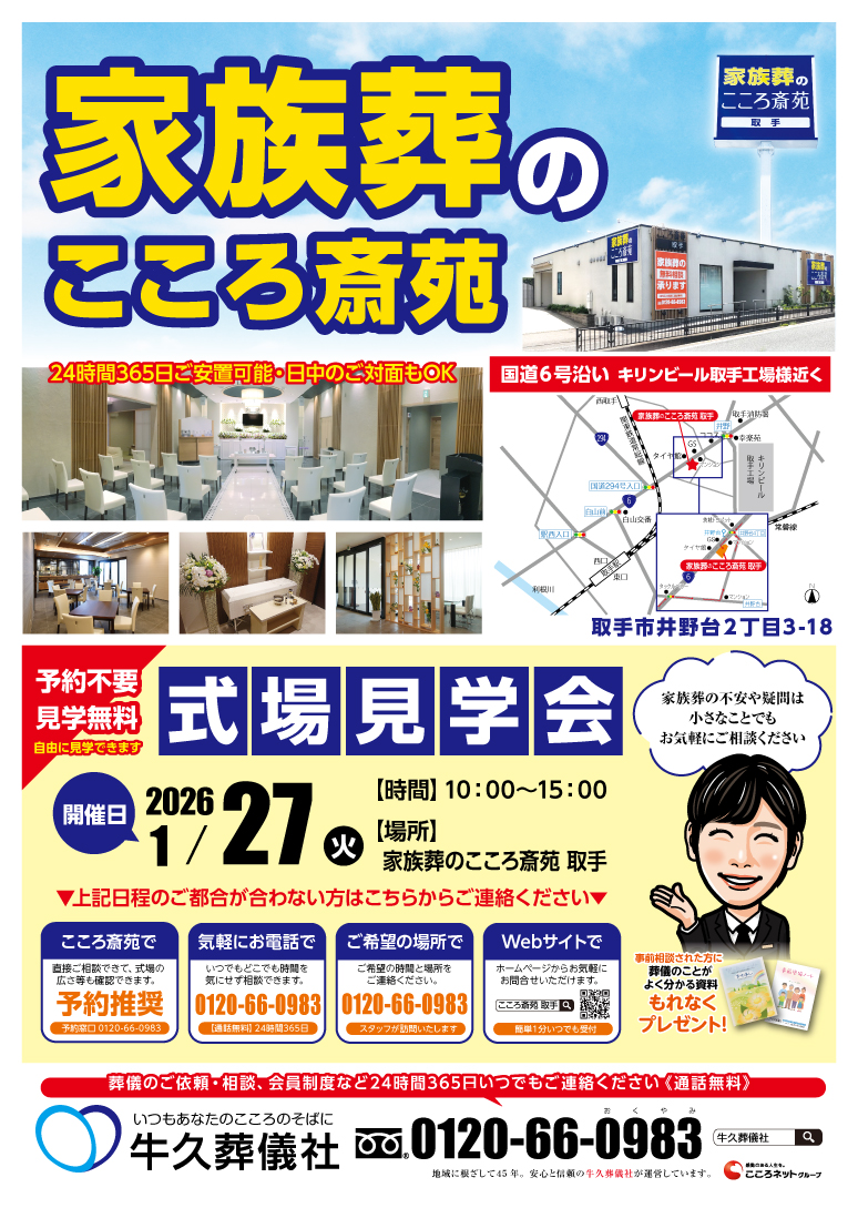 | タイトル | 予約不要の式場見学会(家族葬のこころ斎苑 取手) |