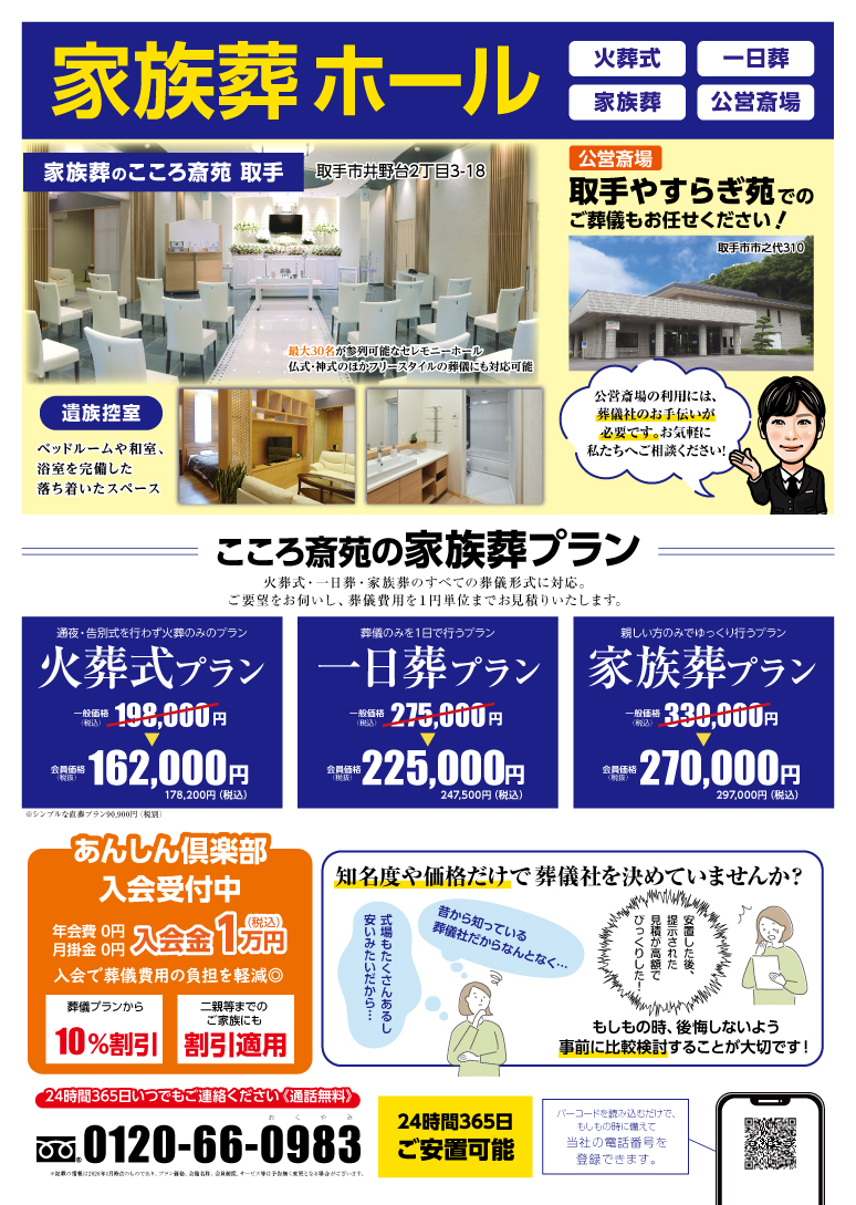 ★家族葬のこころ斎苑 取手式場見学会 開催時間 10:00~15:00 1月27日(火) 式場見学会当日 事前相談をされた方に葬儀のことがよくわかる資料を進呈 ★会員制度入会のご案内 入会金のみでご葬儀費用を軽減!!(入会金のみ月掛金・年会費0円) あんしん倶楽部 通常入会金1万円(税込) 詳しくは、お問い合わせください。