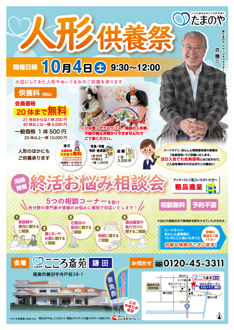 タイトル 人形供養祭&終活お悩み相談会(こころ斎苑 鎌田)