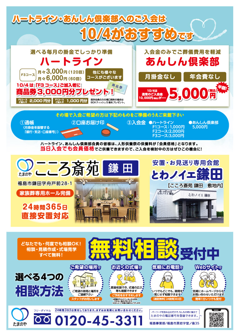 冠婚葬祭互助会 ハートライン 「F 3コース」ご加入者に商品券3,000円分プレゼント!