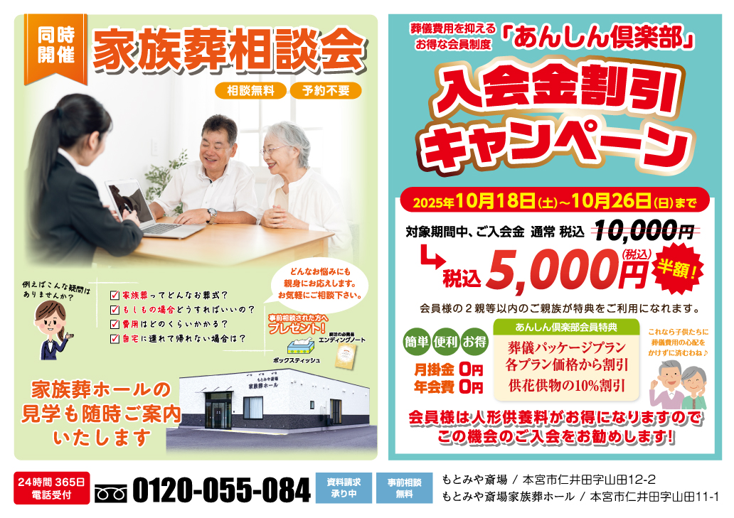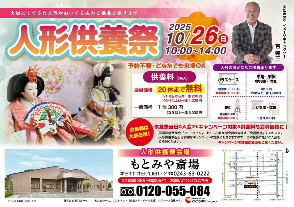 ◆「人形供養祭」(10:00~14:00) 供養料(税込) ・会員価格 20体まで無料 ※21体目からは1体200円 ※40体以上は一律4,000円 ・一般価格 1体300円 ※20体以上一律6,000円 冠婚葬祭互助会「ハートライン」、「あんしん倶楽部」会員の皆様は会員価格でご提供いたします。 人形以外の御供養も承ります。詳しくはお問合せください。 当日の入会でも会員価格で対応いたします。 ★ご入会キャンペーン実施中★ キャンペーン期間 10月18日(土)~10月26日(日) あんしん倶楽部 通常のご入会金10,000円が半額の5,000円(税込) 会員制度についての詳細はスタッフにお尋ねください。 ◆家族葬相談会 「家族葬って聞いたことあるけどどんなお葬式?」「いくらくらいかかるの?」「もしもの時にはまず何からすればいいの?」とご相談される方が増えております。どなたでもお気軽にご相談ください。 ◆家族葬ホール 見学会 ご家族中心の少人数でのご葬儀を希望される方に向けて、もとみや斎場 家族葬ホール 家族葬ホール一度見学されてみませんか?