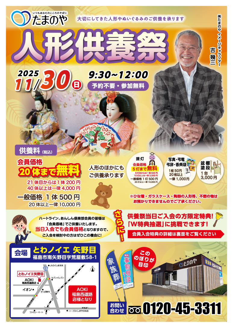 ◆「人形供養」(9:30~12:00) ・会員価格 20体まで無料(21体以上1体200円) (40体以上は一律4,000円) ・一般価格 1体500円 (20体以上一律10,000円) 冠婚葬祭互助会「ハートライン」、「あんしん倶楽部」会員の皆様は会員価格でご提供いたします。 当日の入会でも会員価格で対応いたします。