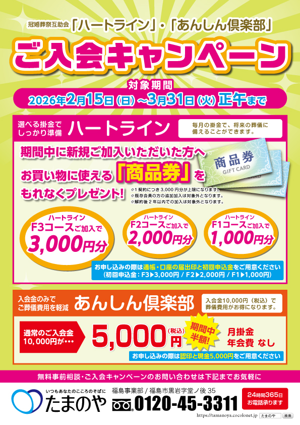 ◆冠婚葬祭互助会「ハートライン」「あんしん倶楽部」ご入会キャンペーン開催