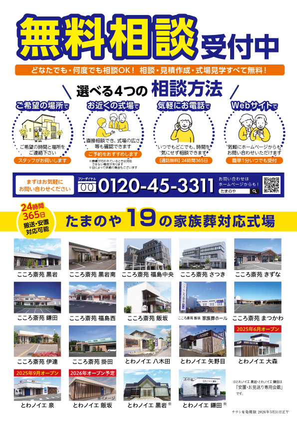 08時30分〜17時00分 たまのや 福島事業部(福島市黒岩字堂ノ後35) こころ斎苑 各会館 とわノイエ 各会館 ぶつだんプラザ 黒岩店(福島市黒岩字堂ノ後65-1) 全ての会館・店舗でご対応しておりますのでお気軽にお問い合わせください。 「都合により、予告なく臨時休業をいただく場合がございます。最新の営業状況はたまのや福島事業部へご確認ください。」 |