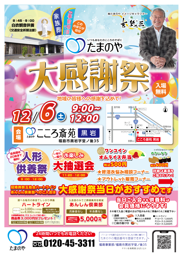 地域の皆様への感謝を込めて!たまのや こころ斎苑 黒岩 「大感謝祭」12月6日(土) 9:00~12:00 【心静かに祈りを捧げる】 「白衣観音供養」(8:45~9:00)(無料)