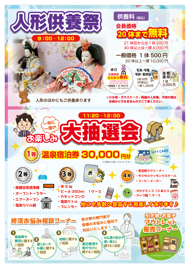 【人形供養】(9:00~12:00) 人形のご供養にお困りではありませんか? ・会員価格 20体まで無料 (21体以上1体200円) (40体以上は一律4,000円) ・一般価格 1体500円 (20体以上一律10,000円) 冠婚葬祭互助会「ハートライン」、「あんしん倶楽部」会員の皆様は会員価格でご提供いたします。 ※人形の入っていたガラスケース・ひな壇・陶器の人形等はお受けできませんのでご了承ください。 当日の入会でも会員価格で対応いたします。