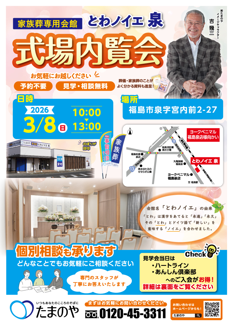 【家族葬専用会館「とわノイエ 泉」式場内覧会】 3月8日(日)10:00~13:00 お気軽にご来館ください。