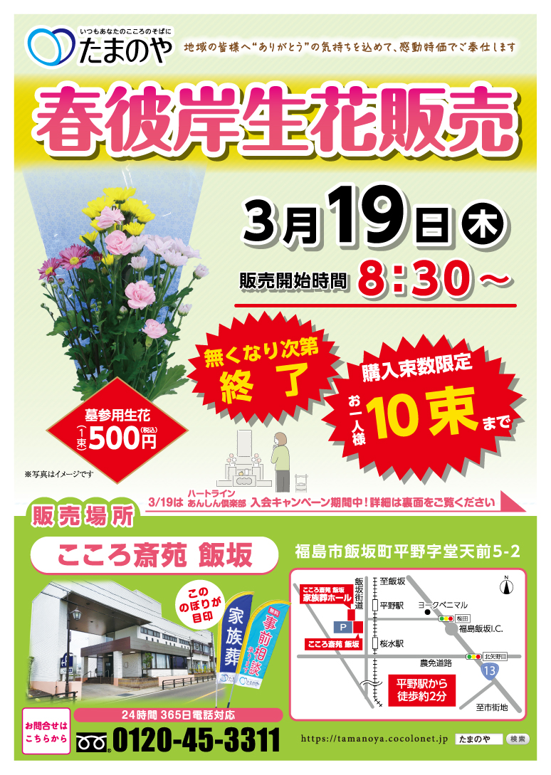 タイトル 3/19(月)春彼岸生花販売(こころ斎苑 飯坂)
