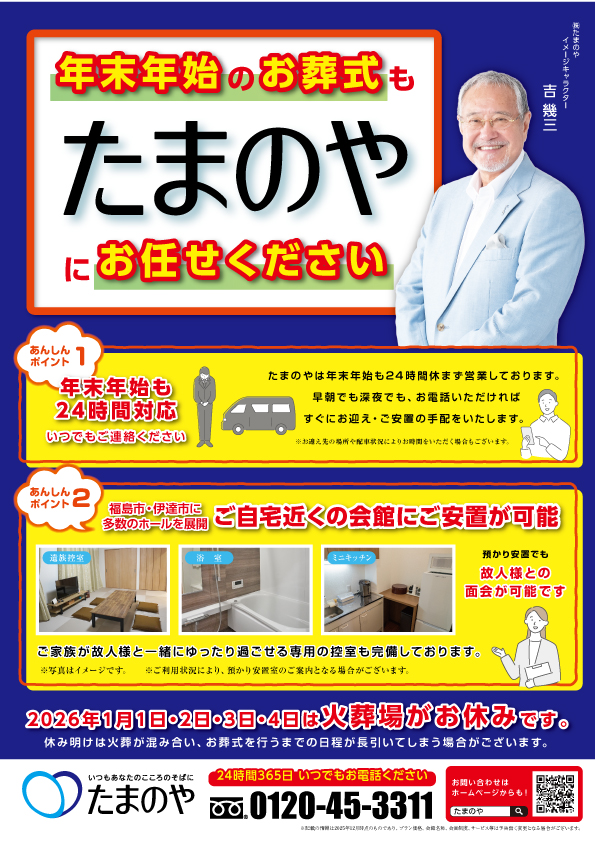 2026年は、1月1日 1月2日 1月3日 1月4日が福島市斎場(火葬場)がお休みです。